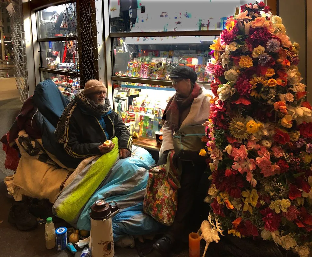 Ein paar Tage später entschloss ich mich an gleicher Stelle zu einem Kontaktversuch. Allzu gern wollte ich wissen, wie die Idee zu diesem Blumenturm entstanden ist, ob er einmal kleiner war und wie die Leute darauf reagieren. Ob der Mann den Turm selbst gemacht, ihn gekauft oder geschenkt bekommen hat. Und wie dieses unglaubliche Spannungsfeld des dick in Wolldecken eingemummten, im Sitzen schlafenden Menschen und einem fast doppelt so hohen, buntblühenden Blumenturm zustande gekommen ist.