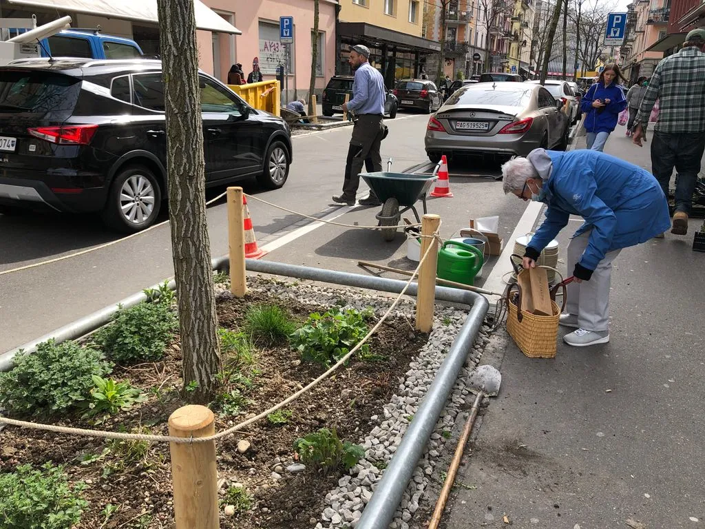Das Wetter war schön und ich beschloss, mir die gemeinsame Pflanzaktion anzuschauen. Ich traf auf ein munteres Treiben. Einige Leute standen bei einem Marktstand und wählten ihre Setzlinge aus. Jemand schob zwischen langsam fahrenden Autos eine Schubkarre mit Kies zu einer Rabatte. Eine Gruppe bereitete den Boden für die Bepflanzung vor. Man sprach miteinander. Die Menschen fragten, was da los sei, die Leute tauschten sich untereinander aus, über ihre Pflanzen, aber auch über das Quartierleben. Ich selbst habe mit Menschen gesprochen, mit denen ich auf der Strasse sonst nicht einfach so ins Gespräch gekommen wäre.