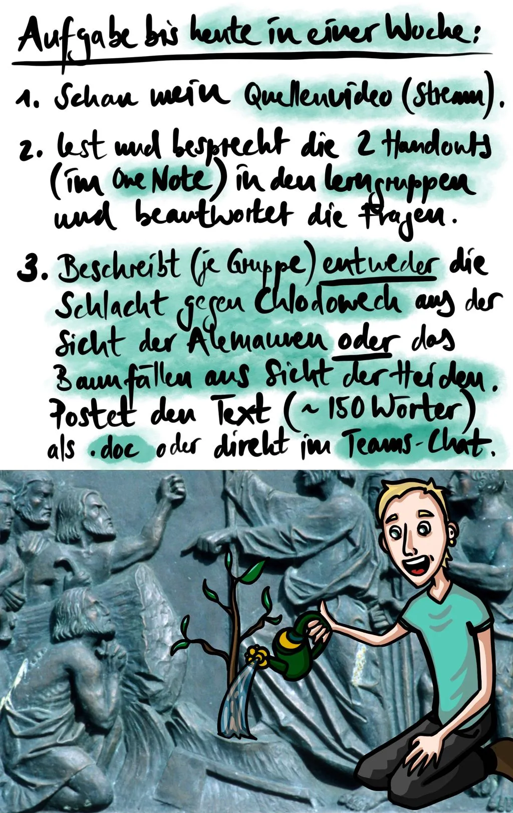 Den wöchentlichen Auftrag bekamen die Schülerinnen in einem Format, das ich schon vor Corona entwickelt hatte. Es gibt eine Quellenbild und dann ungefähr zwei Seiten Text dazu. In der Corona-Zeit habe ich das ergänzt mit einer zusätzlichen Seite, wo ich die Schülerinnen direkt anspreche. Darauf ist ein gezeichnetes Portrait von mir selbst und eine handschriftliche Botschaft, wo ich etwas erkläre oder sie auch frage, wie es ihnen geht. Sie sollen mich als Person wahrnehmen und merken, dass ich mich um sie kümmere. Meine persönliche Seite war zuerst skizzenhaft, ein Strichmännli, später hat es dann einen inhaltlichen Bezug gegeben. Beim Blatt über die Christianisierung der Römer hat mein gezeichnetes Ich den römischen Legionsadler weggekickt und dafür das Zeichen der Christen in der Hand gehalten. Noch später habe ich mich in die Szene hineingemalt, ich war ein Germane auf der Völkerwanderung, wir wurden von den Hunnen angegriffen. Und dann habe ich die Quellenbilder in einem Video erklärt, wo ich den Kontext zeigte, wo hängt das Bild, wie gross ist es, und auf Details gezoomt, über die ich geredet habe.