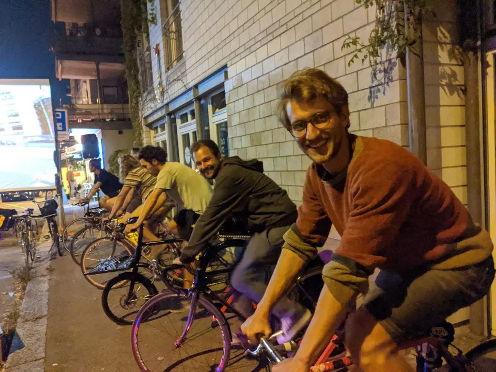 Bevor es losgehen kann, wenden wir uns immer ans Publikum: Wir brauchen dein Velo, leihst du es uns? Wenn die Velos an unsere Generatoren angeschlossen sind, machen wir den zweiten Aufruf: Wir brauchen euch, dass ihr die Velos antreibt! Es braucht schon mindestens fünf Leute gleichzeitig, dass das Kino funktioniert. Die Velos stellen wir immer direkt neben die Zuschauer. Wenn jemand nicht mehr mag, kommt einfach jemand anderes dran. Es ist ein super Gefühl, auf deinem eigenen Velo zu sitzen und Strom zu produzieren.